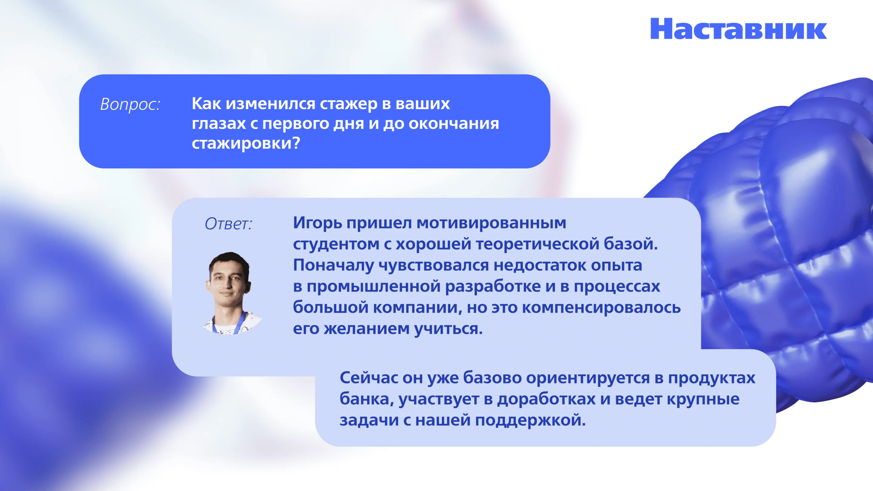 — В первый же день Игорю оформили все доступы и познакомили с командой. Сразу определили ментора — нашего опытного бизнес-аналитика — и составили четкий план погружения в продукты и процессы на полгода. Также Игорь сразу участвовал в дейли и планерках.