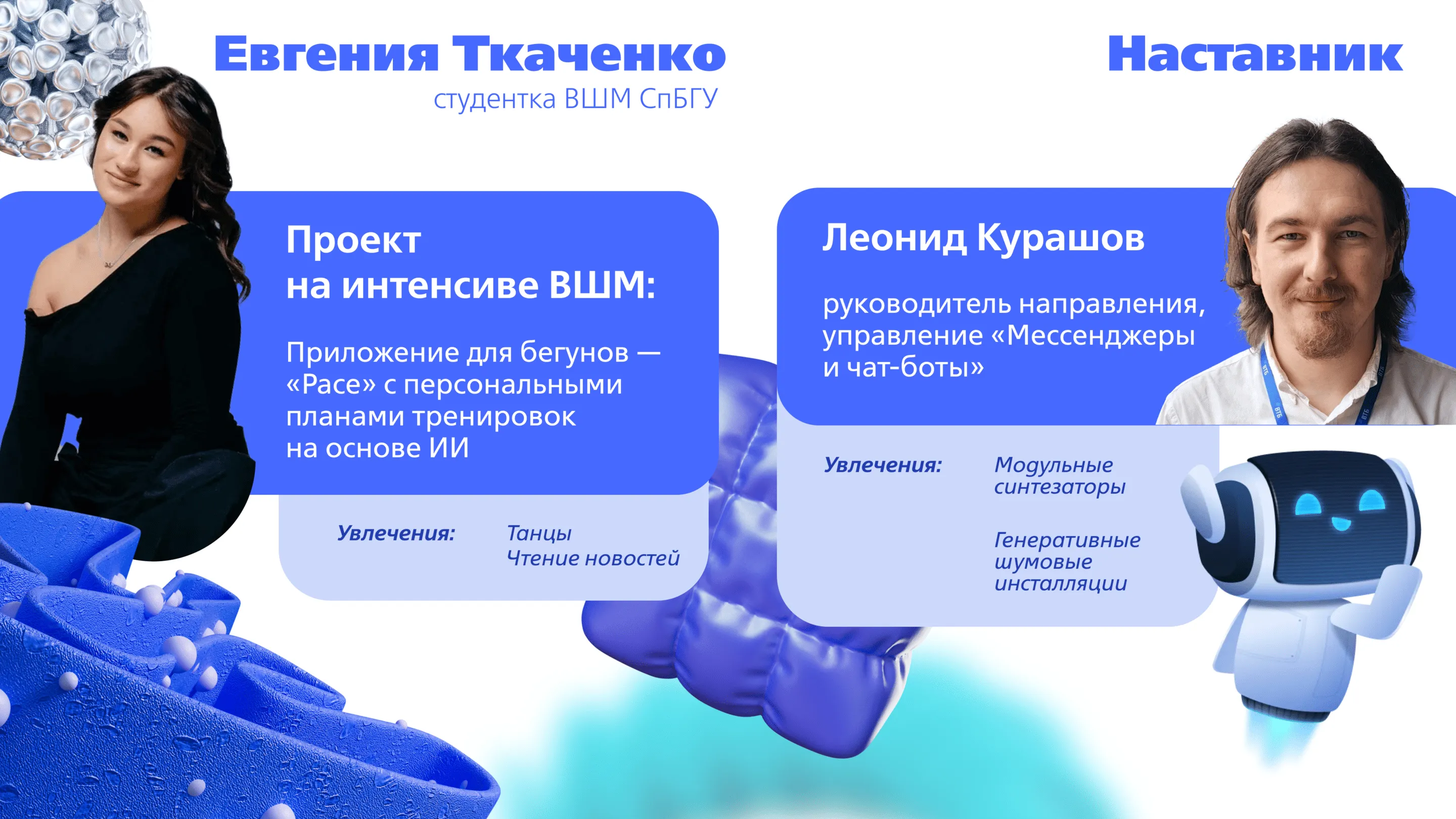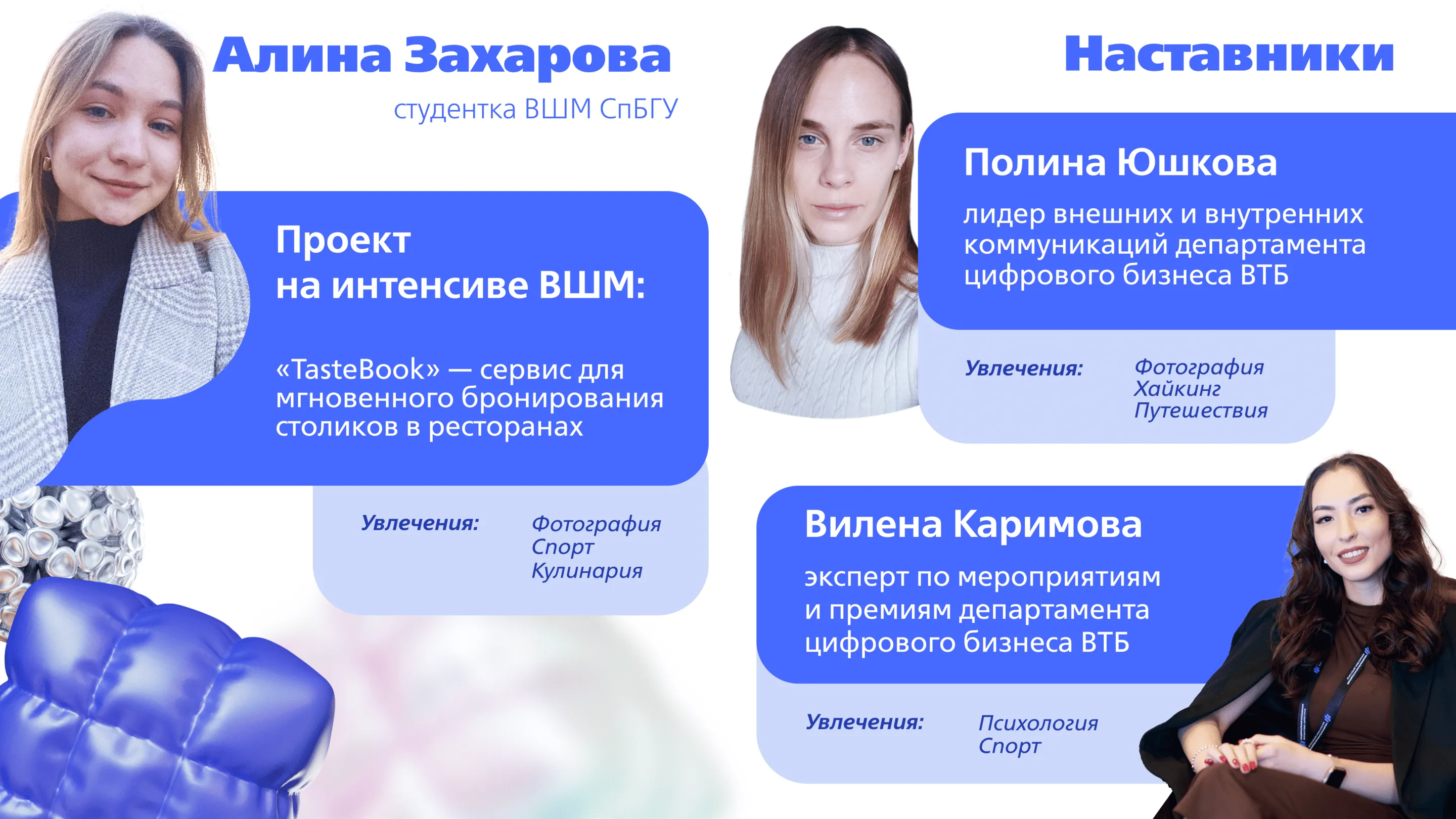 Участие в проектах, таких как продуктовый интенсив ВТБ Онлайн и ВШМ СПбГУ, помогает студентам получить практический опыт и открыть путь к стажировкам в крупных компаниях. Многие ребята уже воспользовались этой возможностью — в следующем материале мы расскажем о тех, кто прошел годовые стажировки в ВТБ.