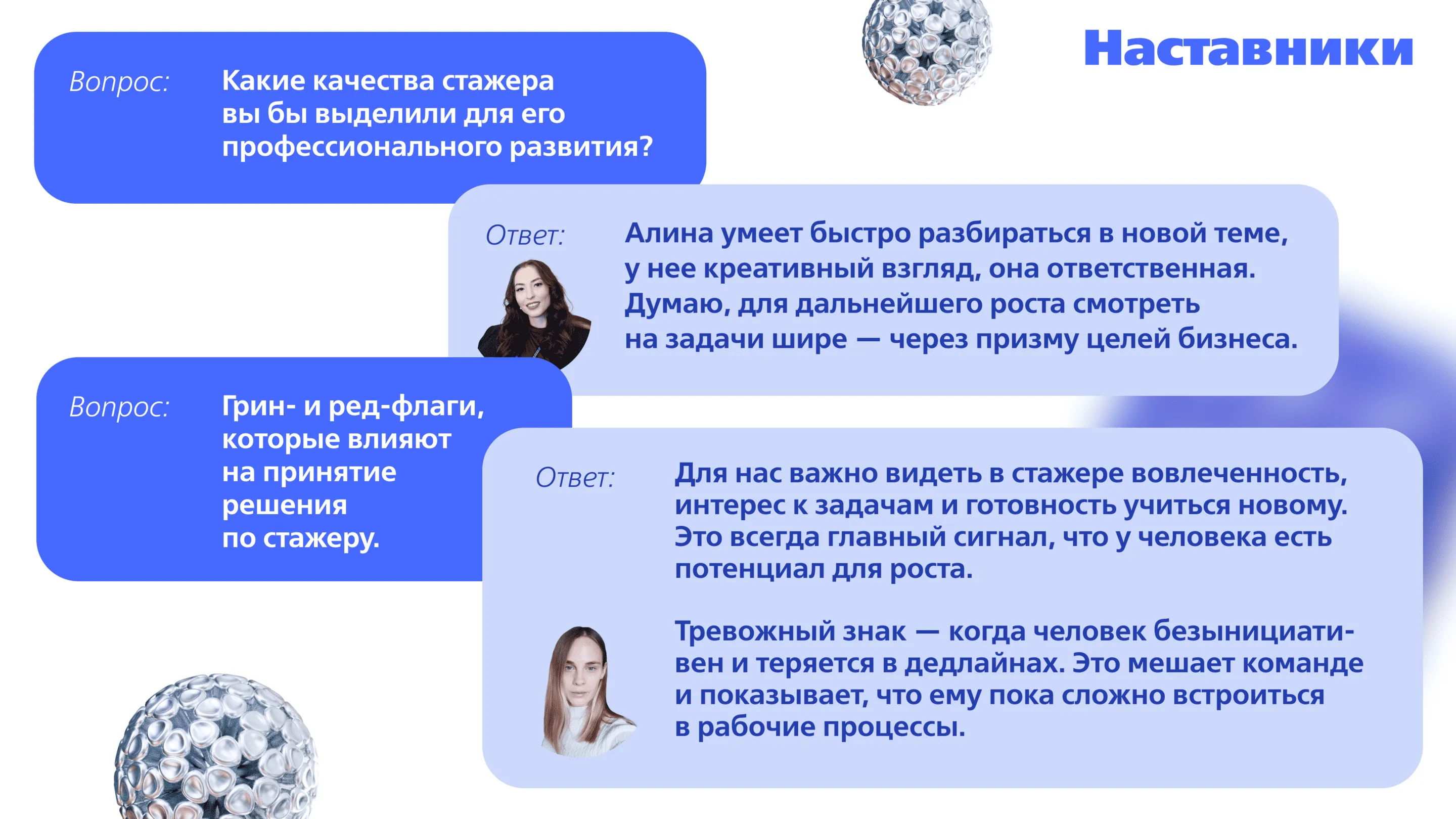 — Вначале Алина выглядела скорее наблюдателем: много слушала, вникала в процессы. Но через несколько дней она стала активнее предлагать идеи и брать инициативу. К концу стажировки Алина достигла высокой степени самостоятельности в работе и с усердием бралась за разноплановые задачи.