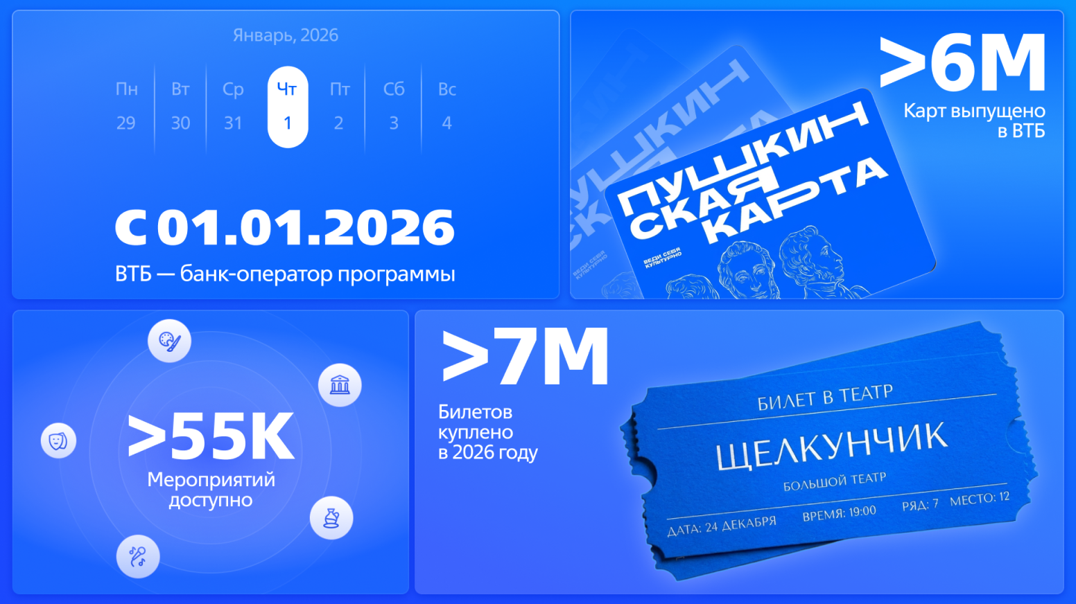 «Пушкинская карта» — уникальная социальная программа поддержки молодых людей от 14 до 22 лет, которая реализуется Министерством Культуры Российской Федерации совместно с Минцифры России и банком-оператором. С 2026 года – это банк ВТБ. В рамках программы молодые люди могут получить специальную карту, на которую государство ежегодно начисляет 5 000 рублей — чтобы ребята по всей стране могли культурно просвещаться и бесплатно ходить в кино, театры и музеи, а также на выставки и концерты, одобренные в программе.